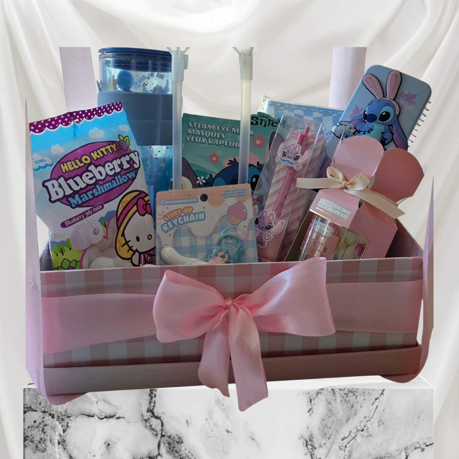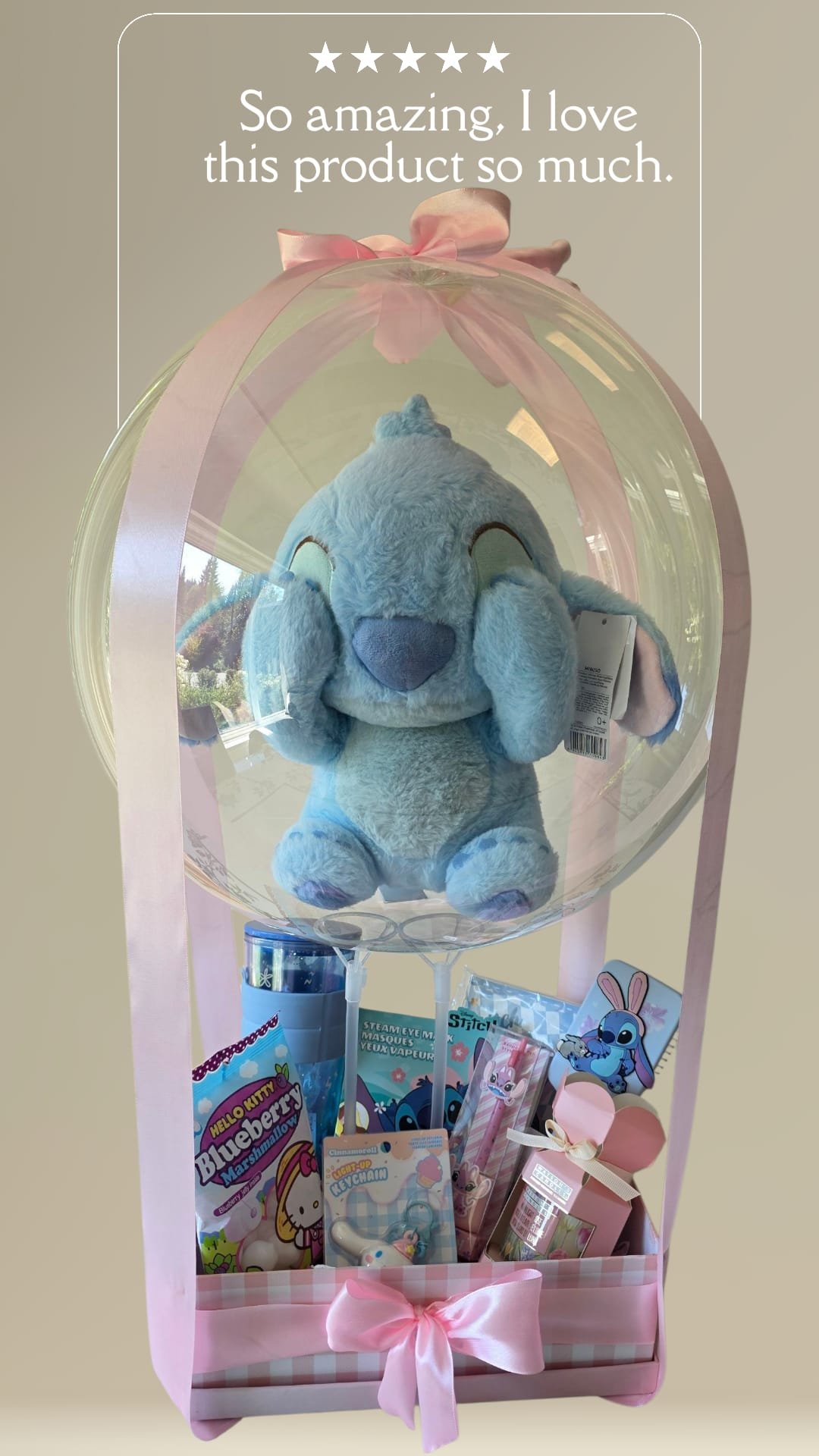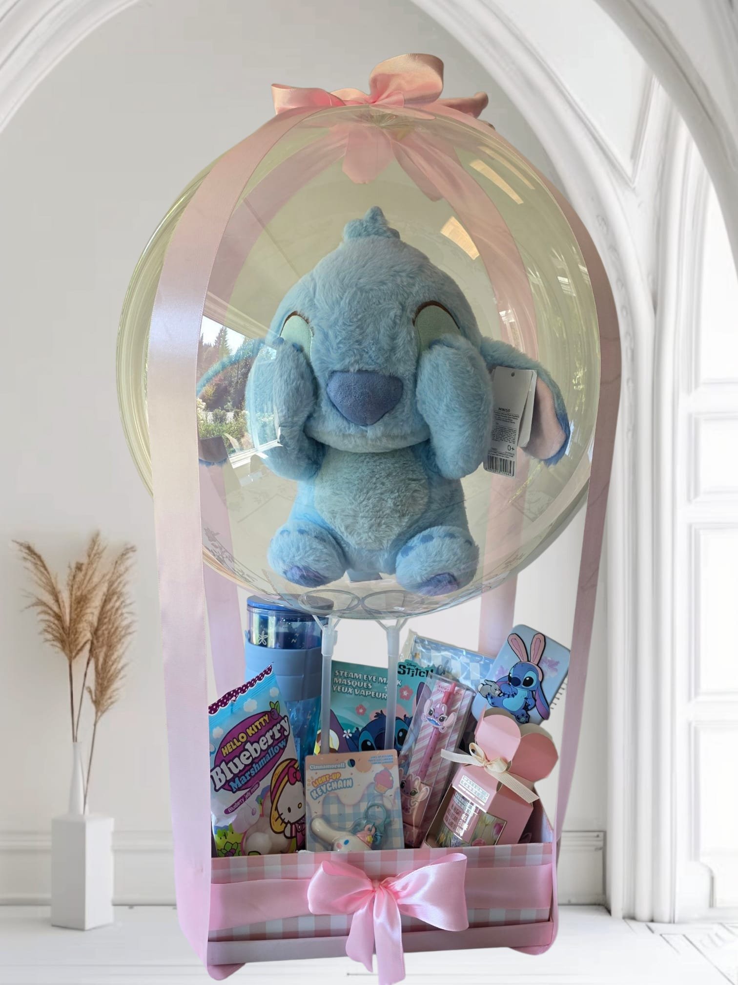 Surprise with our exclusive Stitch Bubble Gift: a cute Stitch plush inside a bubble balloon, accompanied by sweets and unique little gifts that will brighten any special occasion.